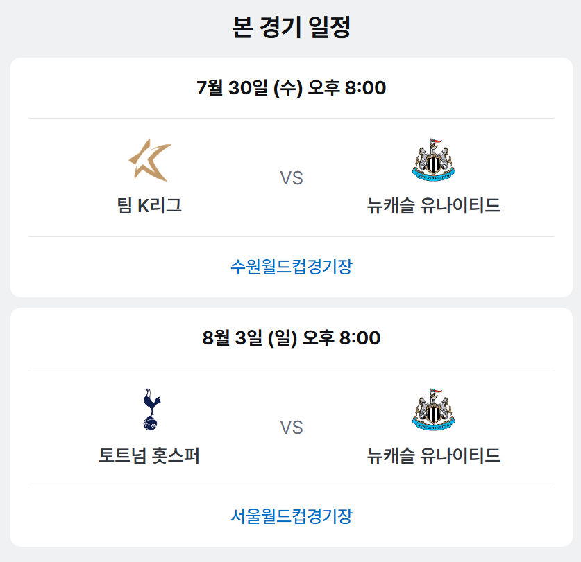 | 팀 K리그 vs 뉴캐슬 | 6월 27일 (금) | 오후 8시 | 2-3시간 |