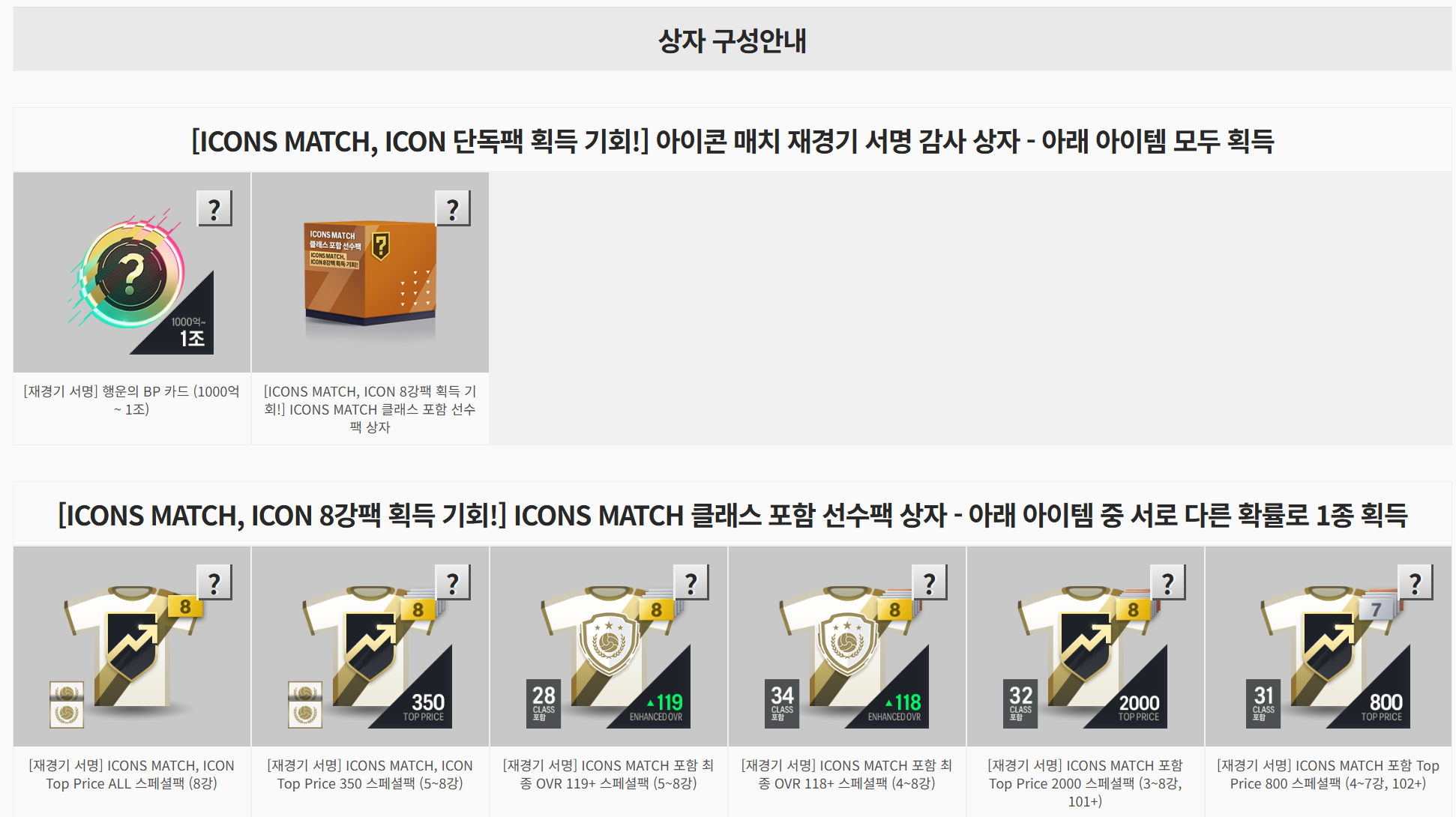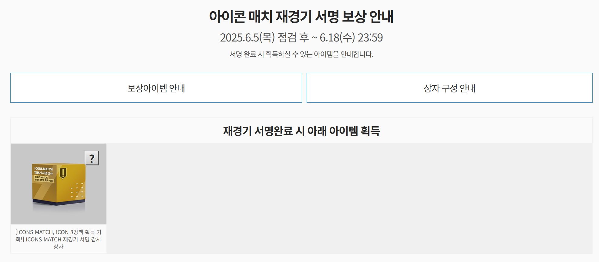 | 이벤트 보상 | ICONS MATCH 재경기 서명 감사 패키지 |