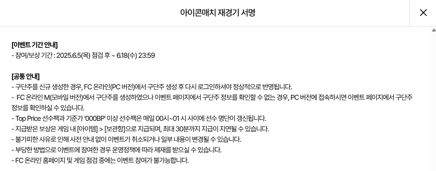 본 포스팅은 넥슨 FC 온라인 공식 아이콘 매치 재경기 서명 이벤트 정보를 바탕으로 작성되었습니다.