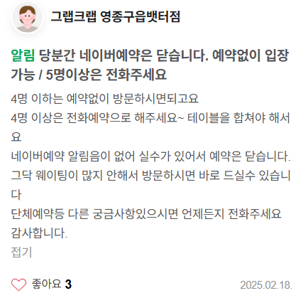 - 4명이하는 예약없이 방문, 4명이상은 전화로 예약가능합니다. (25.2.18 사진 기준)