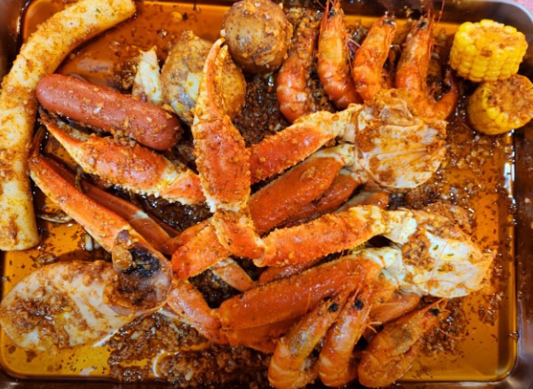 👉 미국식 해물찜의 진한 맛: 한국에서 흔히 접하기 어려운 미국 남부식 보일링크랩 스타일로, 케이준 소스 특유의 강한 풍미와 매콤함이 특징입니다. 매운맛 단계를 선택할 수 있는데, 3단계도 매우 맵지는 않아서 매운 음식을 잘 못 먹는 사람도 도전할 수 있습니다. 소스가 진하고 자극적이어서 호불호가 있을 수 있지만, 미국식 해물찜의 매력을 잘 살렸다는 평가가 많습니다.