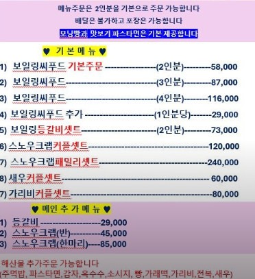 | 보일링씨푸드 기본주문 (2인분) | 58,000원 | 기본 해산물 구성 |