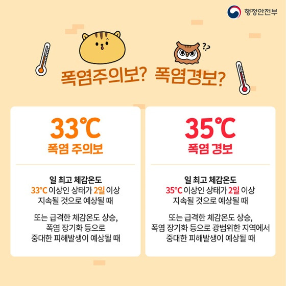 | 폭염주의보 | 일 최고기온 33℃ 이상 2일 이상 지속 시 |